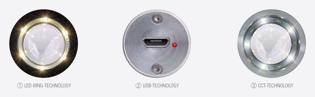 • LED-Ring with 6 concentric LEDs for homogeneous light and high-detail imaging